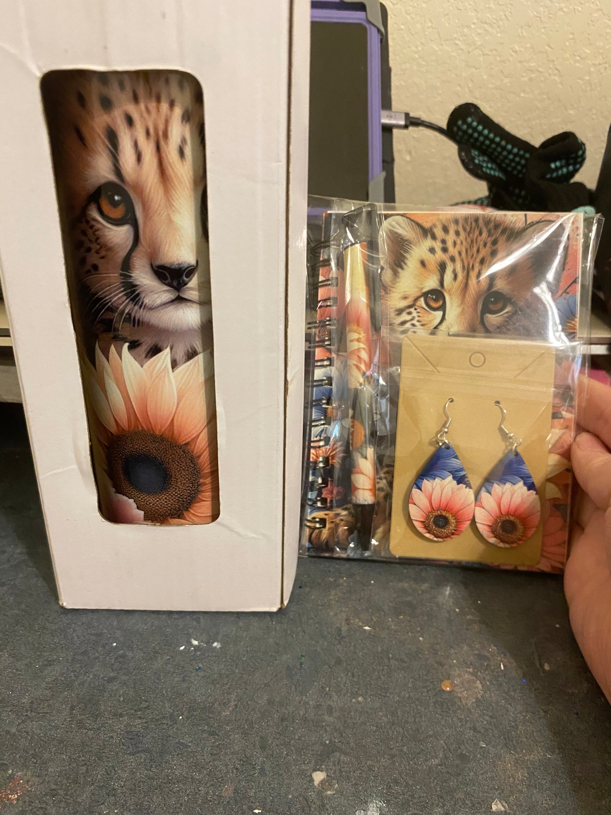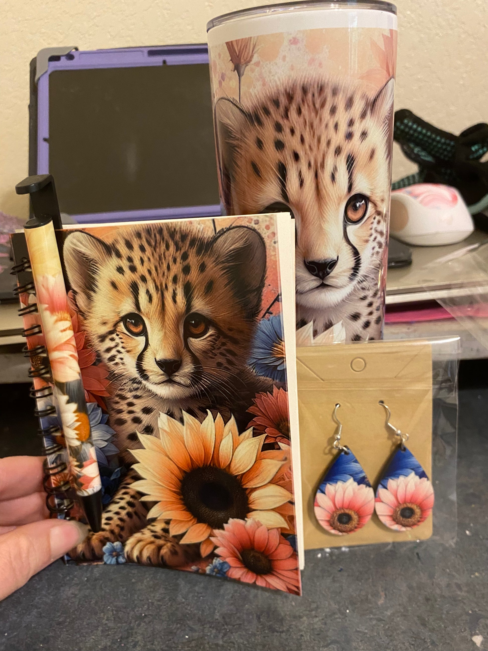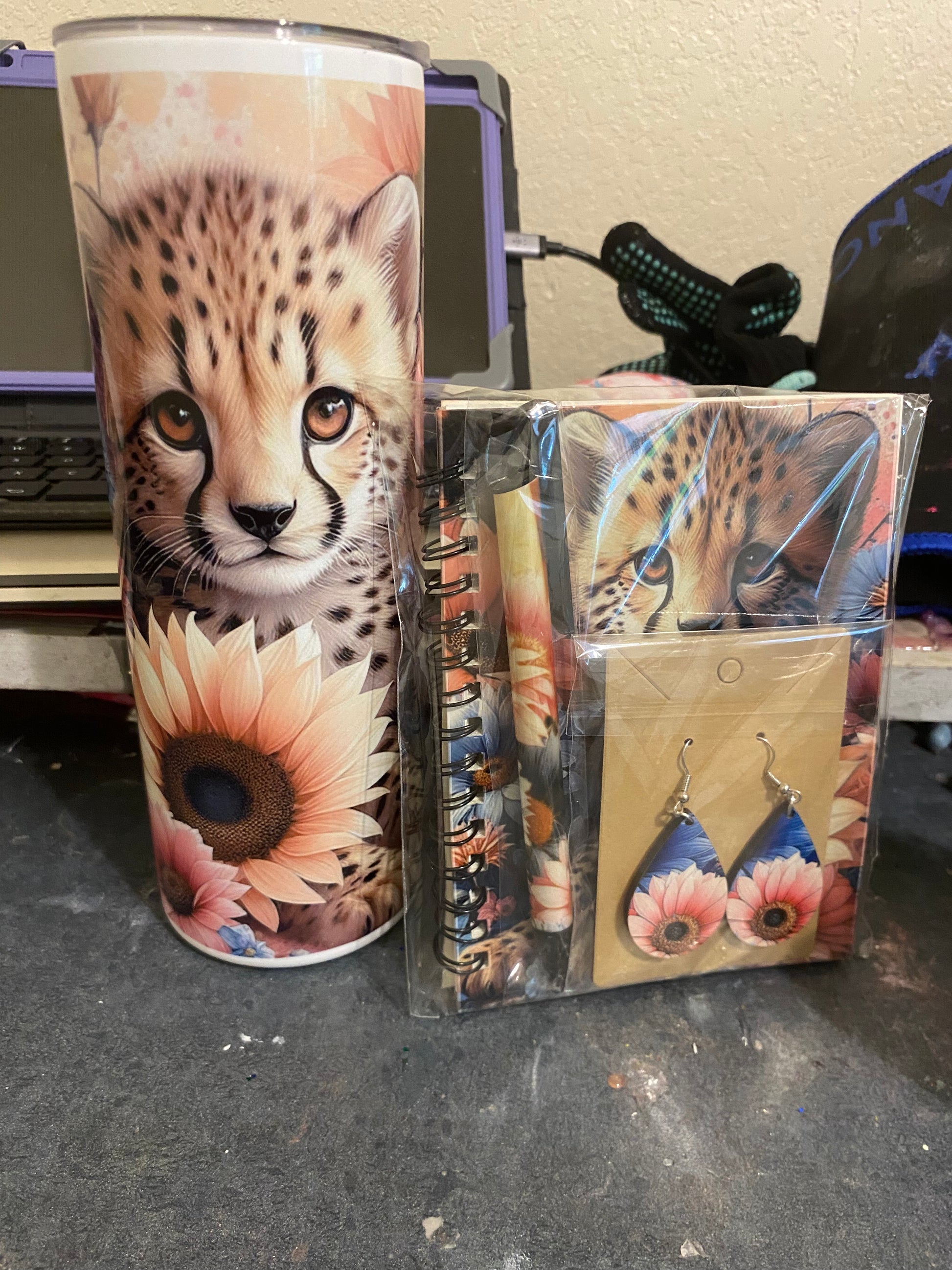 Beautiful bundle that comes was with 20oz skinny tumbler, earrings, notebook and pen of this beautiful cub